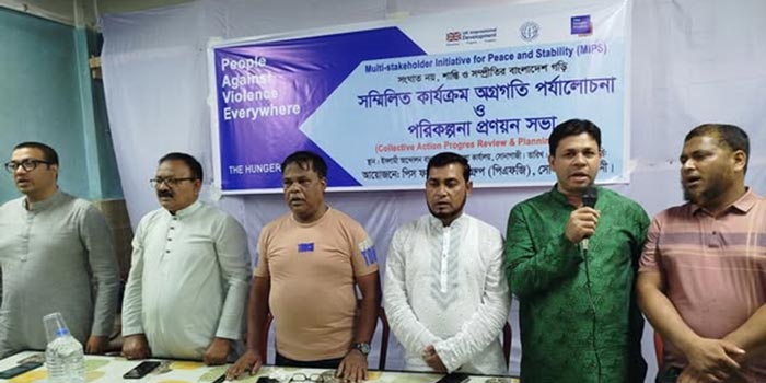 দি হাঙ্গার প্রজেক্ট বাংলাদেশের সহযোগিতায় মাল্টি-স্টেকহোল্ডার ইনিশিয়েটিভ ফর পিস অ্যান্ড স্ট্যাবিলিটি (এমআইপিএস) প্রকল্পের আওতায় ৮ এপ্রিল ২০২৫ তারিখে অনুষ্ঠিত এ সভায় সভাপতিত্ব করেন পিএফজি সদস্য ও পৌর বিএনপির সাবেক সভাপতি আবুল মোবারক। পিএফজি সমন্বয়কারী শেখ আবদুল হান্নান এবং সাংবাদিক আমজাদ হোসাইনের যৌথ সঞ্চালনায় সম্মিলিত কার্যক্রম, অগ্রগতি পর্যালোচনা ও পরিকল্পনা বিষয়ে বক্তব্য রাখেন পিএফজি সদস্য ও পৌর যুবদলের আহ্বায়ক মো. ইকবাল হোসেন, বাংলাদেশ ইসলামী আন্দোলন সোনাগাজী উপজেলা কমিটির সাধারণ সম্পাদক হাফেজ মোঃ হিজবুল্লাহ, জাতীয় পার্টির নেতা মজিবুল হক মানিক, ধর্মীয় নেতা সমর দাস, এনজিও প্রতিনিধি ফরিদা ইয়াসমিন, শাহীদ ফরিদ, মিপস প্রকল্পের ঢাকা অঞ্চলের এরিয়া কো-অর্ডিনেটর মো. রাসেল আহমেদ, ফিল্ড কো-অর্ডিনেটর খোদেজা বেগম।