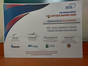 and WaterAid stepped up to acknowledge the courageous efforts of such volunteers with the ‘IVD Bangladesh Volunteer Award 2020’. The theme of the initiative for this year was – ‘Volunteer for COVID-19 Response and Recovery’. From hundreds of participants, after extensive selection process, the best fifteen volunteers were selected and awarded during #iIVD2020 celebration on 5th December at Dhaka. Moyna is prideful one among the fifteen.